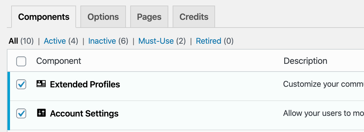 If you need to have cashback site – you must enable advanced User Profiles which will be place where users can see their basic info, change logo, see their cashbacks. So, you must install free Buddypress plugin. After installation, go to Settings – Buddypress – Components. If you need just Cashback and user profiles, keep active only Extended profiles and Account settings + maybe Notifications and disable all other components